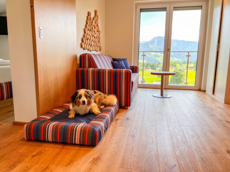 Das Hotel lässt nicht nur die Hundeherzen höherschlagen, sondern auch die von uns Besitzer*innen. Wir durften unseren erholsamen Schlaf im Panoramaapartement „Hochoben“ finden. Das Appartment bietet Platz für bis zu 4 Personen. Und eins sag ich euch: Es war wunderschön und geräumig. Einzig der Balkon war etwas gewöhnungsbedürftig durch die Höhe und die Glasscheibe. Aber das Bett war ein Traum. Wir haben sooo gut geschlafen. Normal komme ich mit Schlafentzug vom Urlaub zurück :D