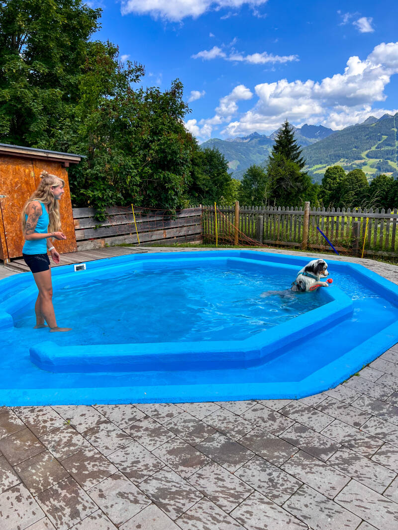 Zudem befindet sich am Hotelgelände ein Agility-Platz mit unterschiedlichen Gräten und Treibbällen. Natürlich alles eingezäunt. :) Und nach dem Schwitzen und getanen Arbeit am Agility-Platz gibts gleich daneben einen Hundepool zur Erfrischung, natürlich auch eingezäunt :) Nyla war anfangs etwas irritiert. Sie kennt ja nur das Schwimmen im See, aber mit etwas Nachhelfen war sie dankbar für die tägliche Erfrischung.